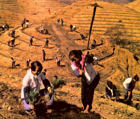 造林民兵正在开挖好的撩壕上种下杉苗。