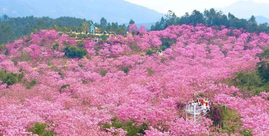 位于鹤山市共和镇来苏村的紫花风铃木,种植面积逾500亩。紫色花海成片绽放,远望似紫色云雾缭绕山野,近观则见蜜蜂翩跹其间,形成“人在花中走,犹如画中游”的沉浸式体验。