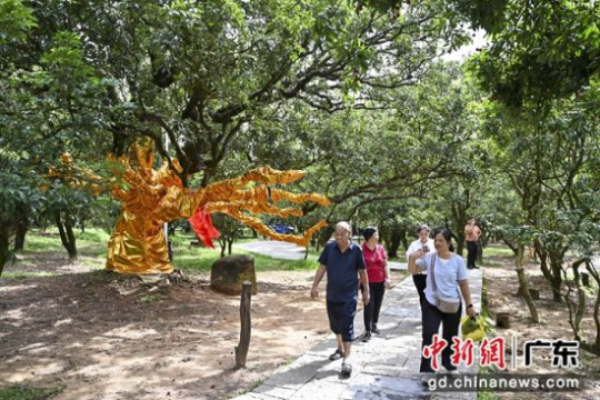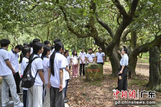 当地依托丰富的古荔枝树资源和历史文化底蕴,因地制宜发展古树乡村游。高州市林业局生态修复股股长郭新喜表示,高州把根子镇贡园与柏桥讲堂、中国荔枝博览馆、红荔阁等绿美景区串联起来,打造了“南粤红绿径”,促进农文旅产业融合发展,助力农户增收致富。图为一群学生在根子贡园内开展研学活动。记者 陈骥旻 摄