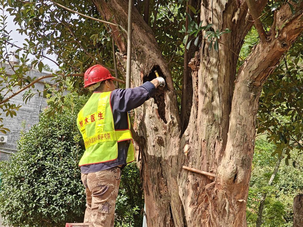 针对古树衰老、病虫害、极端天气等问题,广东推行“一树一策”抢救复壮机制,“十四五”期间累计抢救复壮衰弱濒危古树名木超900株。清远连州市一株550年树龄的红锥古树,在2024年强对流天气中枝桠尽断,林业部门48小时内组建专家团队,通过吊液补养、创口消毒、土壤改良等措施,让古树一年内抽出数十条新枝;云浮郁南县树龄1200多年的“天下第一樟”,经清腐填充、白蚁防治、立地环境改造,成功修复可容纳10余人的巨大树洞;广州中山纪念堂350余年树龄的“木棉王”,通过靶向治虫、高空施药,摆脱天牛虫害困扰。