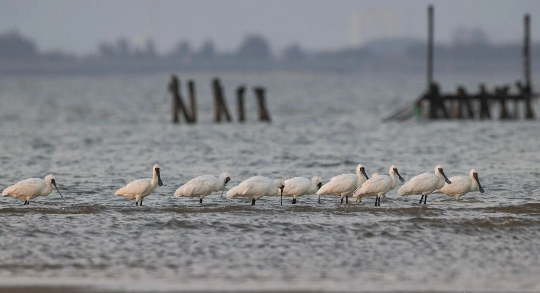 ▲汕头培隆沙滩,国际一级保护野生动物黑脸琵鹭在暖阳下栖息。