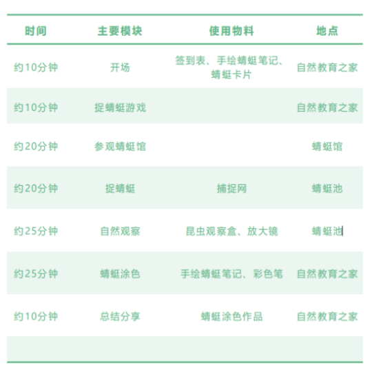 少儿(8-12 岁):启发参与者对蜻蜓的产生好奇与兴趣;帮助参与者了解蜻蜓和豆娘的区别以及蜻蜓的生物特征;引导参与者观察大自然中的蜻蜓。