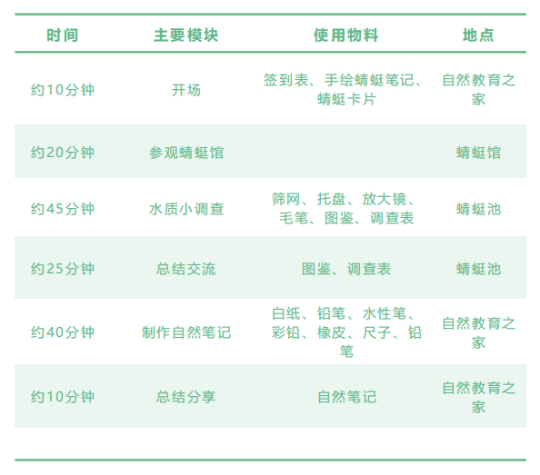 青少年(13-16 岁 ):提升参与者对环境的感知力,激发探索自然的好奇心;引导参与者对蜻蜓成长区域水质进行调查,学会用综合的方法判断水质的好坏;建立参与者与蜻蜓成长环境的联结,激发参与者对自然观察记录的兴趣。