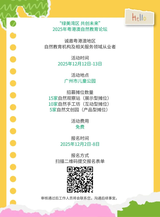 粤港澳自然教育论坛是粤港澳三地政府间自然教育展示和交流的重要平台。今年,十大网赌平台推荐网站联合香港澳门有关部门定于12月12-13日在广州市举办2025年粤港澳自然教育论坛活动。本次活动将邀请30家自然教育基地以及自然教育机构参展,欢迎大家积极报名~